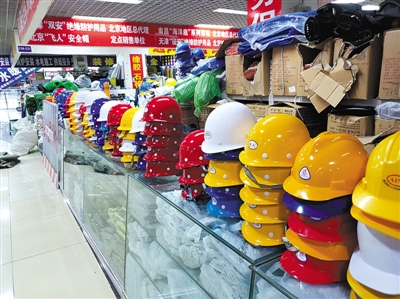 朝陽(yáng)某大型建材市場(chǎng)內(nèi)有各價(jià)位的安全帽出售,商家稱10余元的需求大。新京報(bào)記者 張熙廷 攝