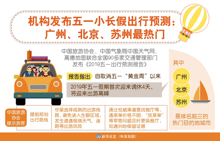 新華社北京4月29日電(記者魯暢)中國(guó)旅游協(xié)會(huì)、中國(guó)氣象局中國(guó)天氣網(wǎng)、高德地圖聯(lián)合全國(guó)90多家交通管理部門(mén)發(fā)布《2019五一出行預(yù)測(cè)報(bào)告》,報(bào)告指出,自取消五一“黃金周”以來(lái),今年五一假期首次迎來(lái)調(diào)休4天,將迎來(lái)出游高峰,其中廣州、北京、蘇州是排名前三的熱門(mén)目的地城市。
