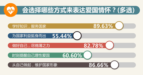 大學(xué)生表達(dá)愛國的方式更加務(wù)實(shí),94.03%的受訪者認(rèn)為“理性愛國是最好的方式”。超過80%的大學(xué)生認(rèn)為愛國要先從自己做起,“學(xué)好知識、服務(wù)國家”“做好自己,為社會盡綿薄之力”等成為很多大學(xué)生的首選。陜西師范大學(xué)學(xué)生強(qiáng)德平說,愛國有三點(diǎn),第一是銘記歷史,第二是展望未來,第三是把握當(dāng)下。中國人民大學(xué)學(xué)生張嘯寒說,走到人民生產(chǎn)實(shí)踐的第一線,是關(guān)心國家和社會的最好方式。