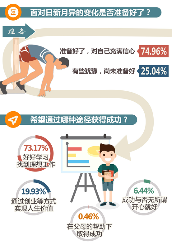 大學(xué)生的自信還體現(xiàn)在希望通過努力獲得成功。93.1%的受訪者希望“好好學(xué)習(xí),從事理想工作”“通過創(chuàng)新、創(chuàng)業(yè)等方式實(shí)現(xiàn)人生價(jià)值”。在采訪中,不少大學(xué)生表示“只要有想法就敢去做”“相信未來有無限可能”。中國地質(zhì)大學(xué)(北京)信息工程學(xué)院兼職輔導(dǎo)員王洪宇說,現(xiàn)在的大學(xué)生不拘泥于傳統(tǒng),更愿意參與創(chuàng)新創(chuàng)業(yè),他們甚至?xí)约簞?chuàng)立新工種,把青年特質(zhì)發(fā)揮到極致。分析認(rèn)為,這一代大學(xué)生成長在國家快速發(fā)展、改革開放不斷深化、國際地位不斷上升、互聯(lián)網(wǎng)與生活緊密融合的時(shí)代,他們的成長環(huán)境更加優(yōu)越,視野更加開闊,這對他們的自我認(rèn)知及性格形成有很大影響,他們更加自信。
