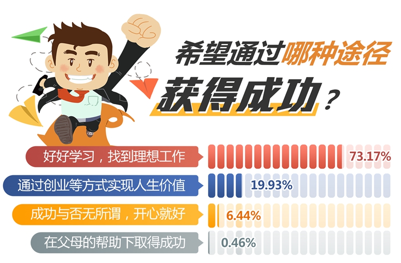 問(wèn)卷調(diào)查中,93.1%的受訪(fǎng)大學(xué)生希望通過(guò)“好好學(xué)習(xí),找到理想工作”和“通過(guò)創(chuàng)業(yè)等方式實(shí)現(xiàn)人生價(jià)值”兩種途徑獲得成功。