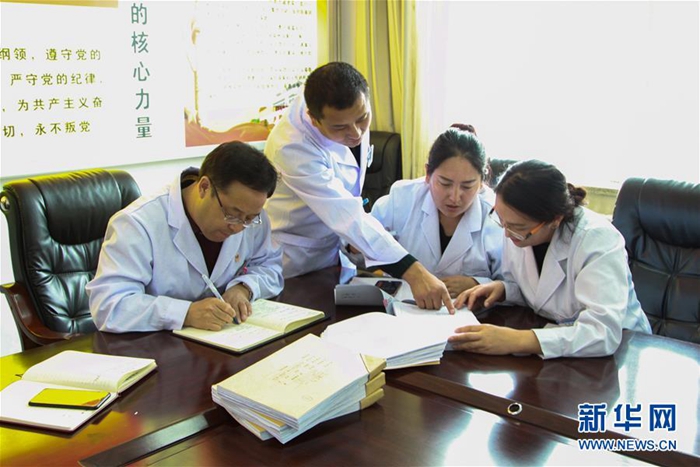 這是來(lái)自北京的援青干部劉云軍(左一)和醫(yī)院職工討論工作(資料照片)。新華社發(fā)
