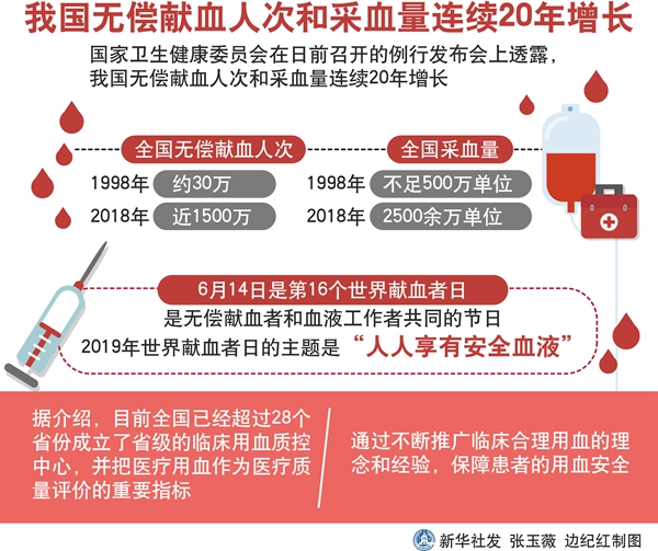 我國無償獻(xiàn)血人次和采血量連續(xù)20年增長