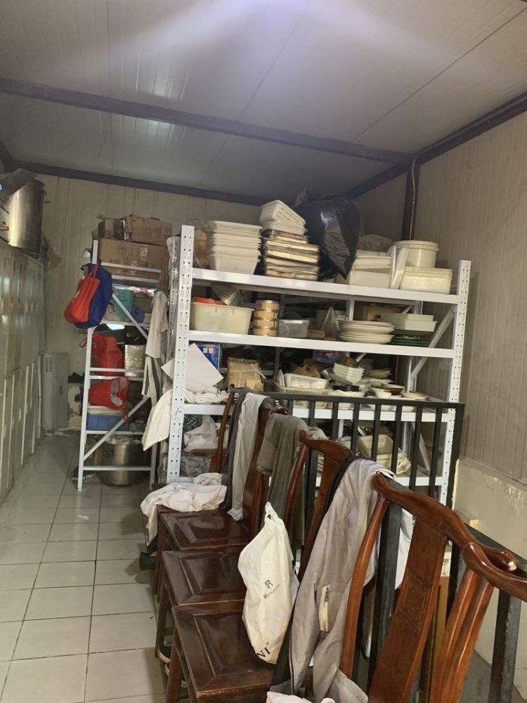 入職當(dāng)天,記者在飯店三樓看到,擺放餐具的倉(cāng)庫(kù)同時(shí)被安排為員工的更衣室。員工的衣物和蒙塵的餐具一同被隨意擺放在儲(chǔ)物架上。