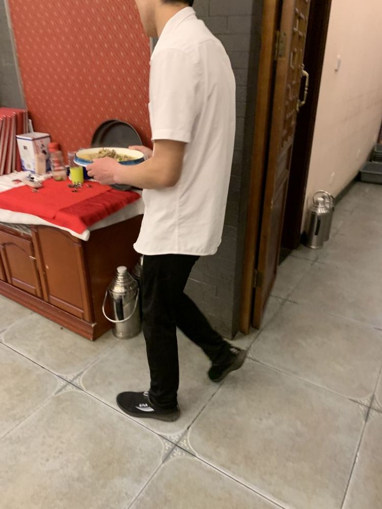 傳菜員端菜時(shí)未使用托盤。圖片來(lái)源:新華社客戶端