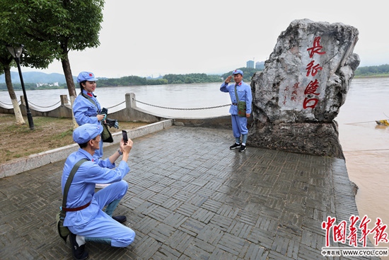6月12日,中央紅軍長(zhǎng)征第一渡紀(jì)念碑園,游客在長(zhǎng)征渡口碑前拍照。 中國(guó)青年報(bào)·中青在線記者 李建泉/攝