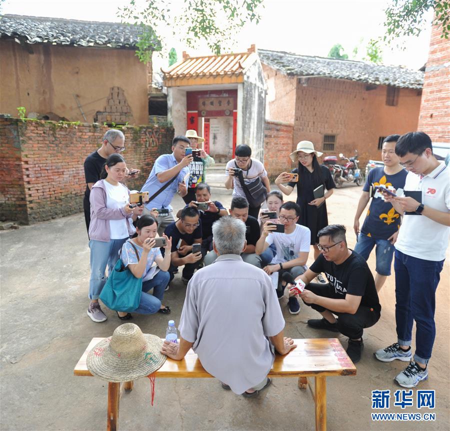 6月22日,在廣東省南雄市烏逕鎮(zhèn)新田村,媒體記者在紅軍入粵第一仗舊址采訪廣東省南雄市史志辦原副主任李君祥(中)。新華社記者 李任滋 攝