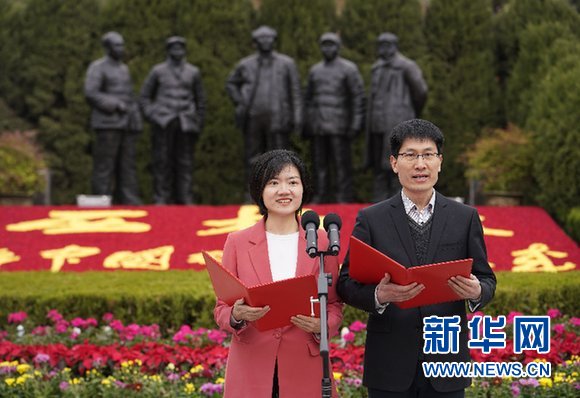 3月28日在西柏坡,記者代表在“壯麗70年·奮斗新時(shí)代”大型主題采訪(fǎng)活動(dòng)啟動(dòng)儀式上宣讀倡議。新華社記者 邢廣利 攝