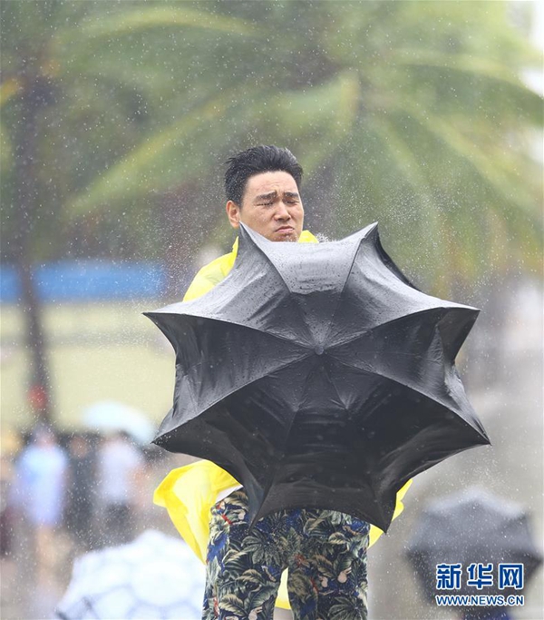 7月3日,行人在海南省三亞市街頭冒雨出行。新華社發(fā)(陳文武 攝)