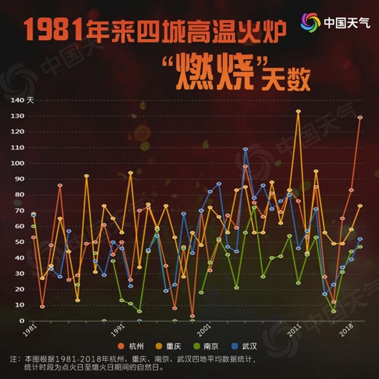 從1981年至2018年的平均數據統(tǒng)計來看,北方火爐“點”得早“熄”得也早,相比之下,江南華南火爐耐力更足,“燃燒”時間更長,往往9月才最后“熄火”。