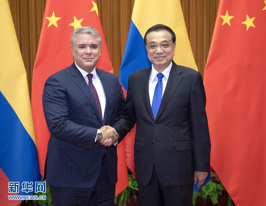 7月31日,國(guó)務(wù)院總理李克強(qiáng)在北京人民大會(huì)堂會(huì)見來華進(jìn)行國(guó)事訪問的哥倫比亞總統(tǒng)杜克。 新華社記者 李濤 攝