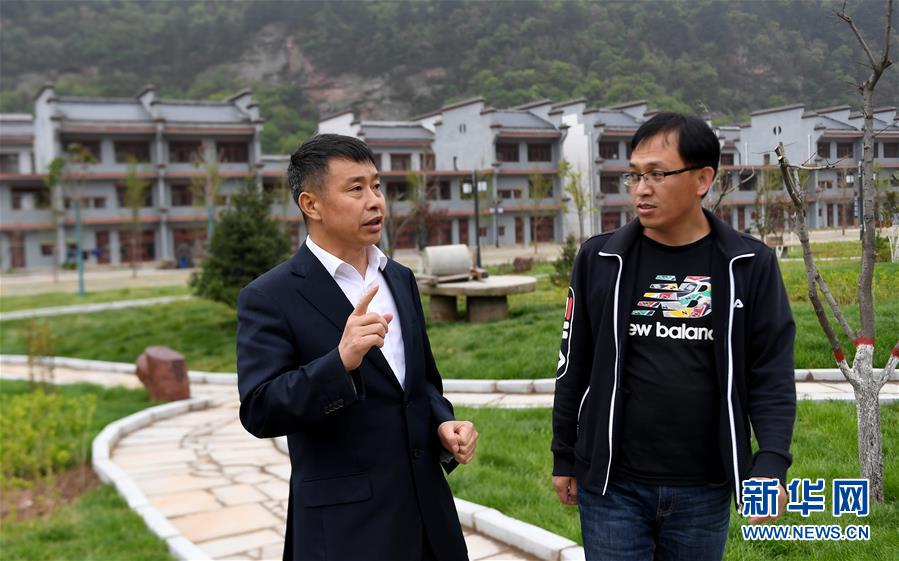 陜西延安黃陵縣雙龍鎮(zhèn)索洛灣村黨支部書記柯小海(左)和村干部在交流村里發(fā)展情況(4月28日攝)。新華社記者 劉瀟 攝