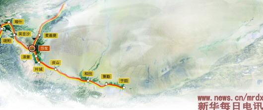 打開(kāi)地圖,沿著古絲綢之路一路向西,在敦煌分了一個(gè)岔,一路向北的叫北線,一路向南的叫南線,中間隔著塔克拉瑪干大沙漠。南線沿著沙漠邊緣,在昆侖山脈水系的滋潤(rùn)下,出現(xiàn)一串珍珠似的綠洲:樓蘭、于田、莎車……