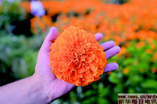 從2011年開(kāi)始,萬(wàn)壽菊被帶到了這里,生根繁衍,從300畝、3萬(wàn)畝……一直到16萬(wàn)畝,而且還將繼續(xù)蔓延開(kāi)來(lái),匯成花的海洋!