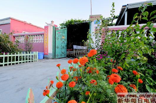 莎車縣維吾爾族農(nóng)戶的院子門(mén)前也栽滿了萬(wàn)壽菊花。