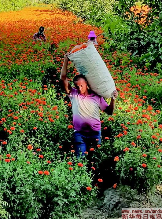 2019年7月,在新疆莎車縣依蓋爾其鎮(zhèn),依乃克帕塔村維吾爾族農(nóng)民們正忙著采摘萬(wàn)壽菊。在每年6月到9月的花期,每10天可采摘一次,一年最多可采摘8至10次。
