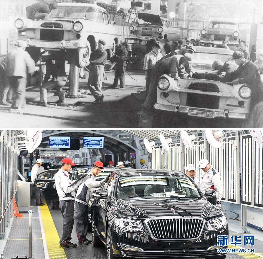拼版照片:上圖為20世紀50年代拍攝的第一批紅旗轎車生產(chǎn)線(資料照片);下圖為在一汽紅旗總裝車間內(nèi),一汽紅旗職工在對生產(chǎn)的紅旗轎車進行靜檢作業(yè)(新華社記者許暢2019年4月9日攝)。新華社發(fā)