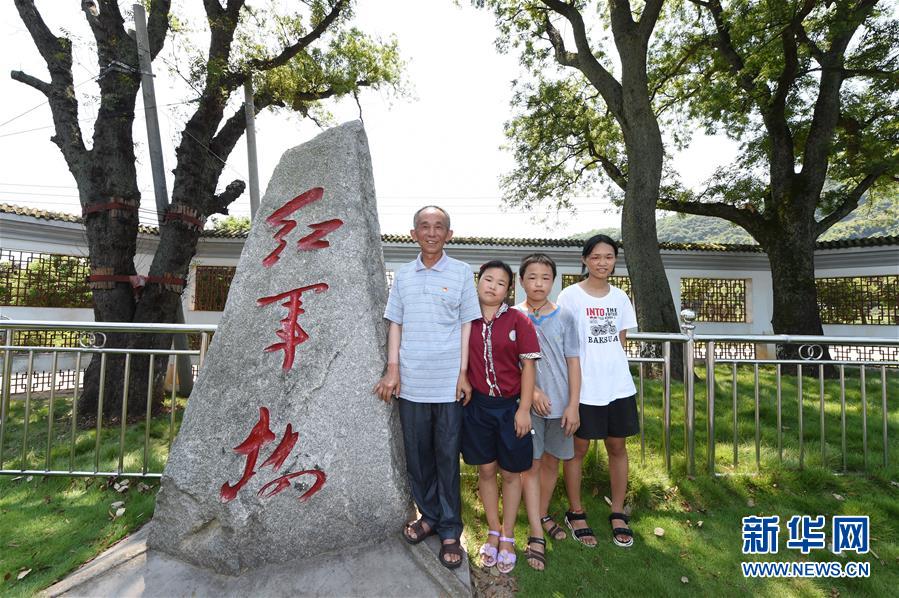 在湖北省石首市桃花山紅軍樹革命烈士紀(jì)念園,67歲的守樹人劉克樹在“紅軍樹”前與他的孫輩合影(8月1日攝)。新華社記者 羅曉光 攝