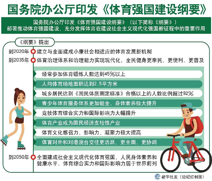 《綱要》提出,到2020年,建立與全面建成小康社會相適應(yīng)的體育發(fā)展新機(jī)制。到2035年,體育治理體系和治理能力實(shí)現(xiàn)現(xiàn)代化,全民健身更親民、更便利、更普及,經(jīng)常參加體育鍛煉人數(shù)達(dá)到45%以上,人均體育場地面積達(dá)到2.5平方米,城鄉(xiāng)居民達(dá)到《國民體質(zhì)測定標(biāo)準(zhǔn)》合格以上的人數(shù)比例超過92%;青少年體育服務(wù)體系更加健全,身體素養(yǎng)極大提升;競技體育綜合實(shí)力和國際影響力大幅提升,體育產(chǎn)業(yè)成為國民經(jīng)濟(jì)支柱性產(chǎn)業(yè),體育文化感召力、影響力、凝聚力極大提高,體育對外和對港澳臺交往更活躍、更全面、更協(xié)調(diào)。到2050年,全面建成社會主義現(xiàn)代化體育強(qiáng)國,人民身體素養(yǎng)和健康水平、體育綜合實(shí)力和國際影響力居于世界前列。