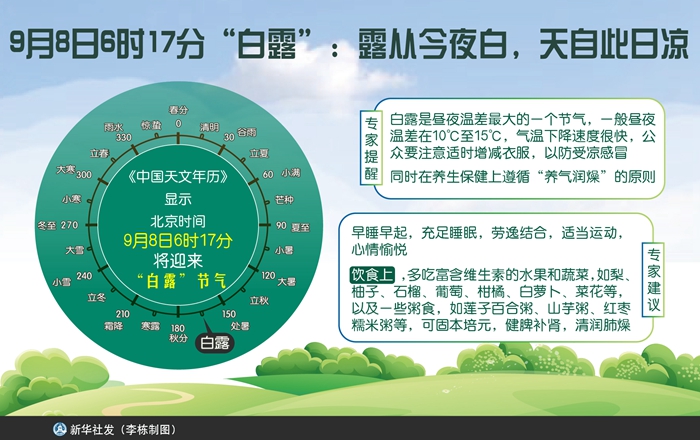 新華社天津9月6日電(記者周潤?。皯{闌久,金波漸轉(zhuǎn),白露點蒼苔。”《中國天文年歷》顯示,北京時間9月8日6時17分將迎來“白露”節(jié)氣。專家提醒說,此時節(jié)“秋老虎”將逝去,氣溫開始下降,天氣逐漸轉(zhuǎn)涼,公眾要注意養(yǎng)氣潤燥。