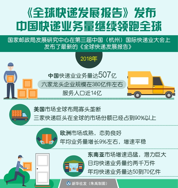 報(bào)告分析稱,中國快遞業(yè)業(yè)務(wù)量領(lǐng)先,市場活躍,2018年業(yè)務(wù)量達(dá)507億,六家龍頭企業(yè)規(guī)模在380億件左右,服務(wù)人口近14億;美國市場全球布局寡頭壟斷,三家快遞巨頭在全球的市場份額已經(jīng)占到90%以上;歐洲市場成熟,態(tài)勢良好,年均業(yè)務(wù)量增長9%左右,增速平穩(wěn);東南亞市場增速迅猛,潛力巨大,日均快遞業(yè)務(wù)量約兩千萬件,年均快遞業(yè)務(wù)量達(dá)50到70億件。