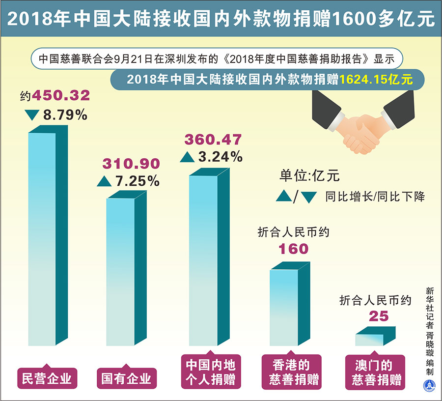新華社深圳9月21日電(記者王豐、李曉玲)中國慈善聯(lián)合會(huì)21日在深圳發(fā)布的《2018年度中國慈善捐助報(bào)告》顯示,2018年中國大陸接收國內(nèi)外款物捐贈(zèng)1624.15億元。