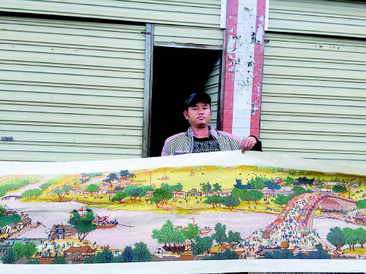 七米多長(zhǎng)的刺繡,要三個(gè)人一起拿著才能全部展示,上面的人物栩栩如生。吳琰花了三年時(shí)間,用了72種不同顏色的線,繡成了這幅有400多個(gè)人物形象的十字繡。“橋這個(gè)地方最難繡,人流太密集,光這一小段就花了三個(gè)多月時(shí)間。”他指著刺繡上那座人流如織的大橋說。