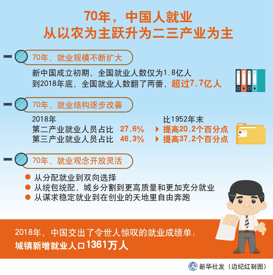 70年,就業(yè)規(guī)模不斷擴(kuò)大。新中國成立初期,全國就業(yè)人數(shù)僅為1.8億人;到2018年底,全國就業(yè)人數(shù)翻了兩番,超過7.7億人,彰顯了中國就業(yè)領(lǐng)域取得的不俗成就。
