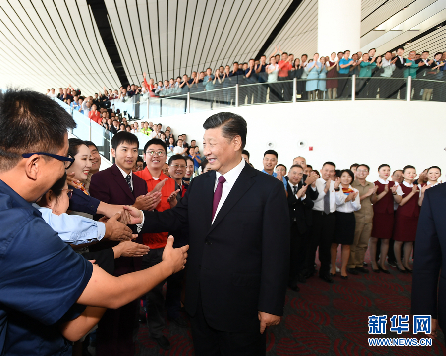 9月25日上午,北京大興國際機場投運儀式在北京舉行。中共中央總書記、國家主席、中央軍委主席習(xí)近平出席儀式,宣布機場正式投運并巡覽航站樓。這是習(xí)近平看望參與機場建設(shè)和運營的工作人員代表,同他們親切交談。 新華社記者 鞠鵬 攝