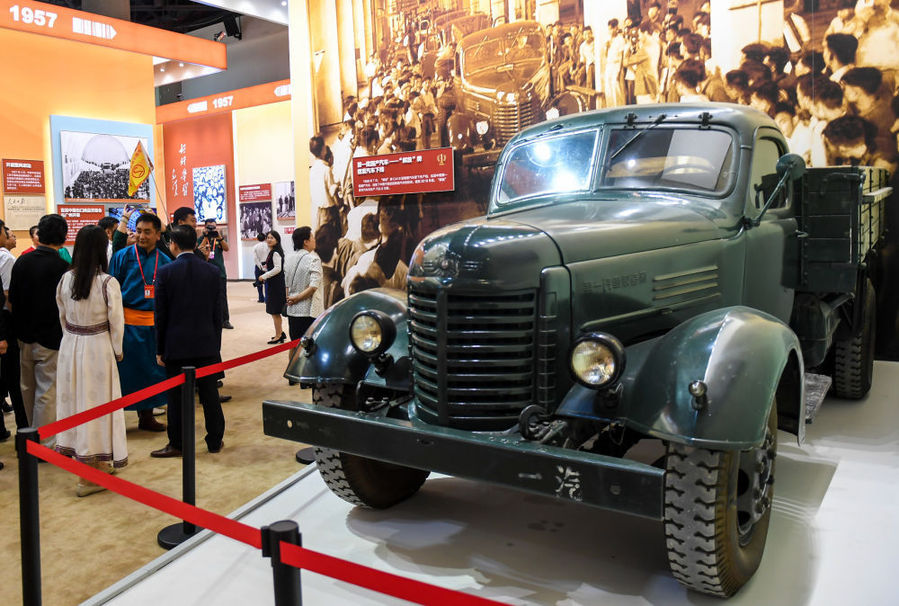 “偉大歷程 輝煌成就——慶祝中華人民共和國(guó)成立70周年大型成就展”上1956年制造的“解放”牌汽車。新華社記者彭源攝