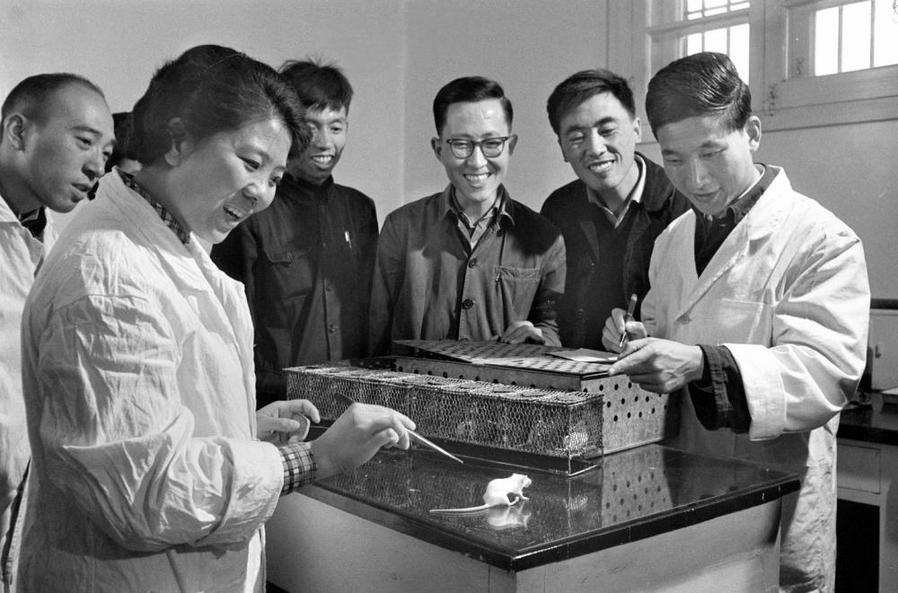 1965年9月17日,中國(guó)首次人工合成了結(jié)晶牛胰島素。圖中科學(xué)工作者正在將人工合成的產(chǎn)物注入小白鼠體內(nèi),測(cè)驗(yàn)它的生物活力。新華社資料照片