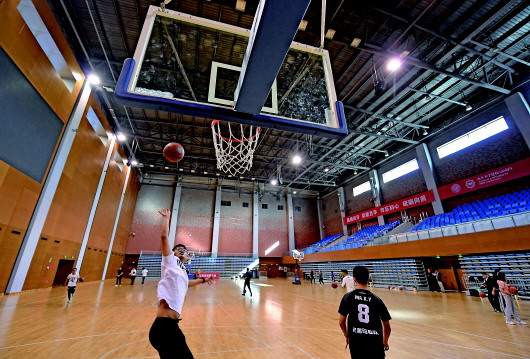 學(xué)生們?cè)谀祥_大學(xué)津南校區(qū)體育館內(nèi)運(yùn)動(dòng)(10月14日攝)。新華社記者李然攝