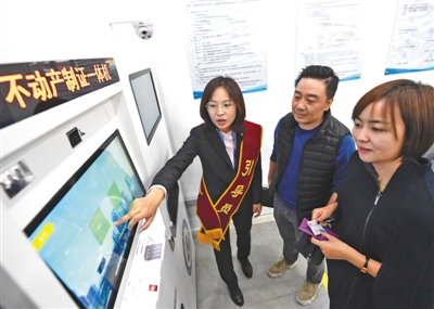 昨日,朝陽區(qū)不動產(chǎn)登記事務(wù)中心,工作人員講解不動產(chǎn)制證一體機的使用方法。 新京報記者 吳寧 攝