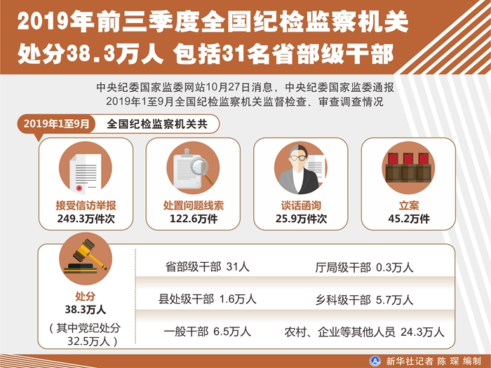 2019年前三季度全國紀(jì)檢監(jiān)察機關(guān)處分38.3萬人 包括31名省部級干部-新華網(wǎng)