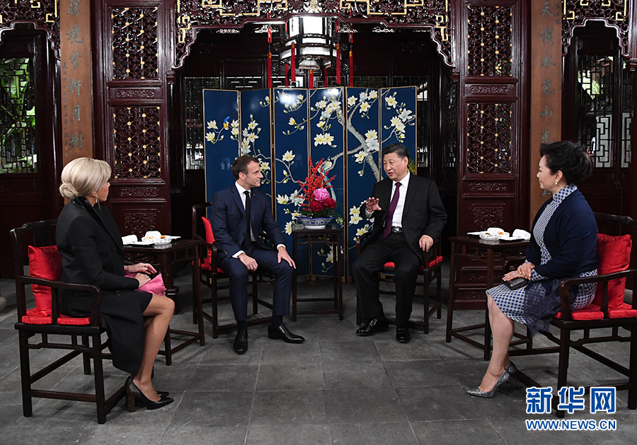 兩國元首夫婦在玉華堂落座。習近平和彭麗媛愉快地憶及今年3月訪問法國受到馬克龍夫婦熱情款待的情景。習近平說,歡迎馬克龍總統(tǒng)再次訪華并第一次來上海。上海是中國改革開放和發(fā)展進步的縮影,體現(xiàn)了近代以來中國同世界關(guān)系的演變。希望這次訪問有助于你了解上海、了解中國。我和夫人選擇在豫園款待總統(tǒng)先生和夫人,希望你們能領(lǐng)略中華園林之美和中國的傳統(tǒng)文化。文化藝術(shù)表現(xiàn)形式不同,但帶給不同國家民眾的心靈體驗是相通的,不同文化可以和諧共生。中法作為東西方兩大文明代表,應該相互尊重,交流互鑒,各美其美,美美與共。