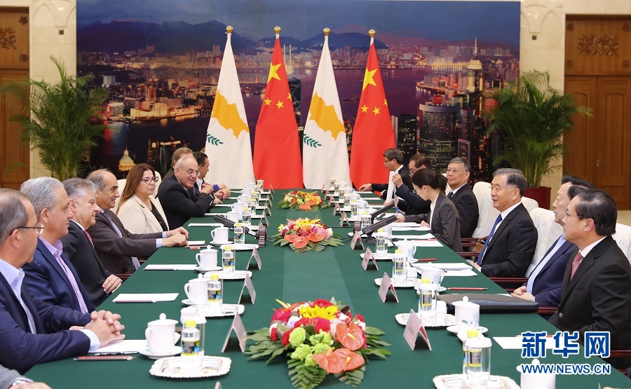 11月8日,全國政協(xié)主席汪洋在北京人民大會堂會見塞浦路斯議長西盧里斯?!⌒氯A社記者 鞠鵬 攝