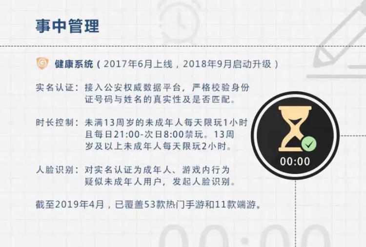 以目前體系搭建最全面的騰訊為例,2017年7月開始,以《王者榮耀》為試點,推出“健康游戲防沉迷系統(tǒng)”,限制未成年人每天登錄時長;2018年9月起,對新用戶身份信息與公安權威數(shù)據(jù)平臺進行比對,以此為標準決定是否將新用戶納入未成年人防沉迷體系……