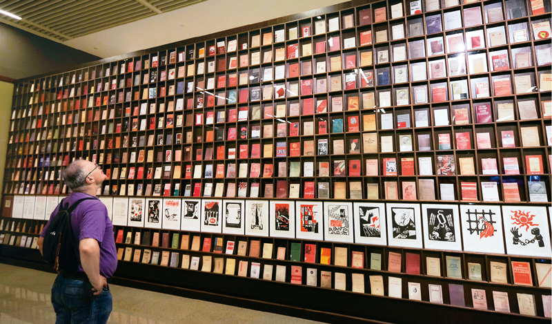 2018年5月9日,一位外國(guó)觀眾被北京“真理的力量——紀(jì)念馬克思誕辰200周年主題展覽”中一面展示不同國(guó)家出版的500多種《共產(chǎn)黨宣言》的書(shū)墻所吸引。 中新社記者 賈天勇/攝