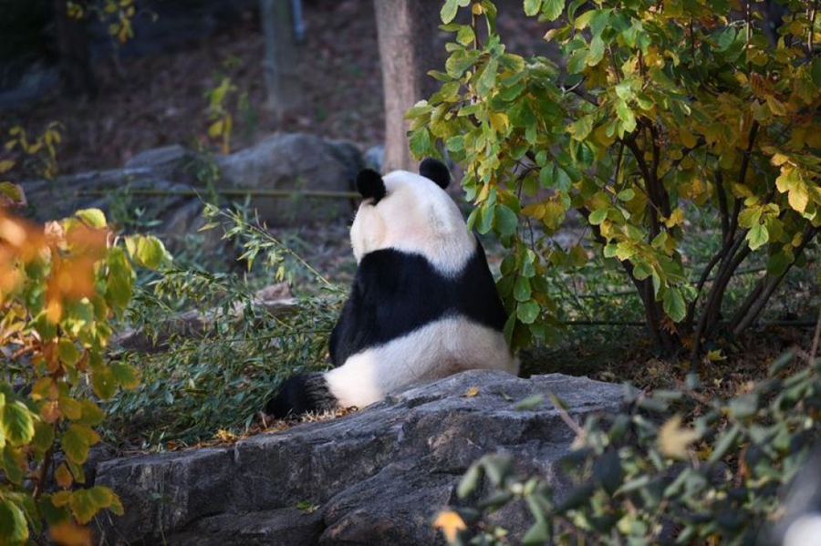 11月13日,“貝貝”在位于華盛頓的美國(guó)國(guó)家動(dòng)物園內(nèi)的“銷魂”背影。新華社記者劉杰攝