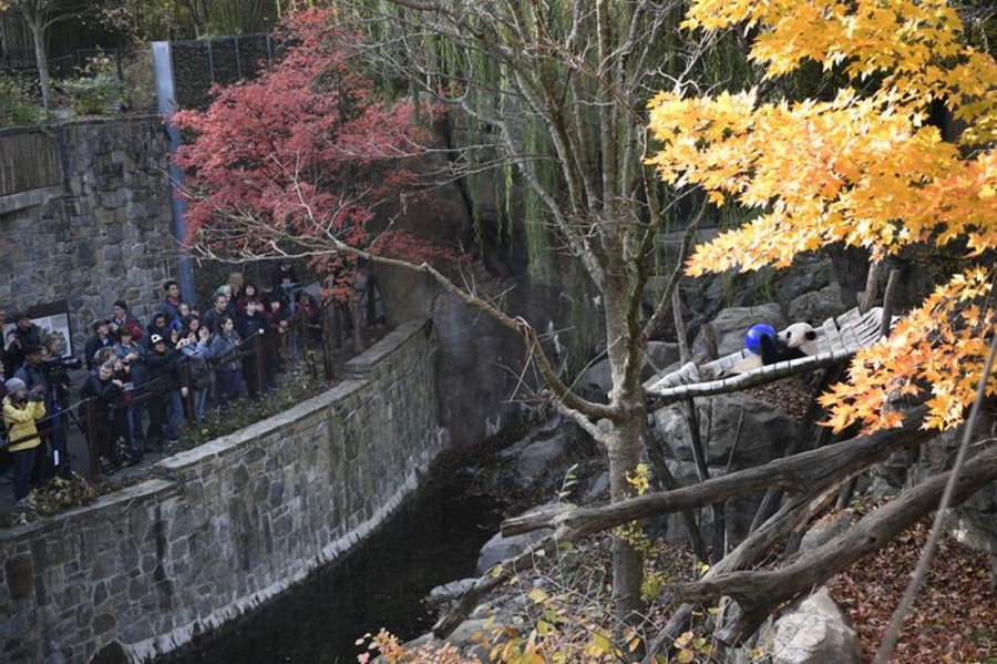 11月11日,在美國(guó)國(guó)家動(dòng)物園,“貝貝”和游客見面。新華社記者劉杰攝