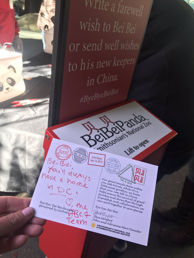 工作人員還在熊貓館外設(shè)立了一處臨時(shí)明信片中心。老老少少都在明信片上寫下給“貝貝”的祝福。據(jù)介紹,這些明信片也會(huì)一同送到中國(guó)。