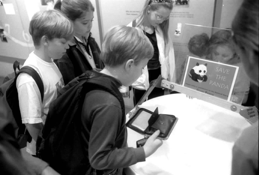 2000年5月21日,一些孩子在美國(guó)國(guó)家動(dòng)物園大熊貓館內(nèi)為拯救大熊貓基金會(huì)捐獻(xiàn)硬幣。新華社記者王巖攝(傳真照片)