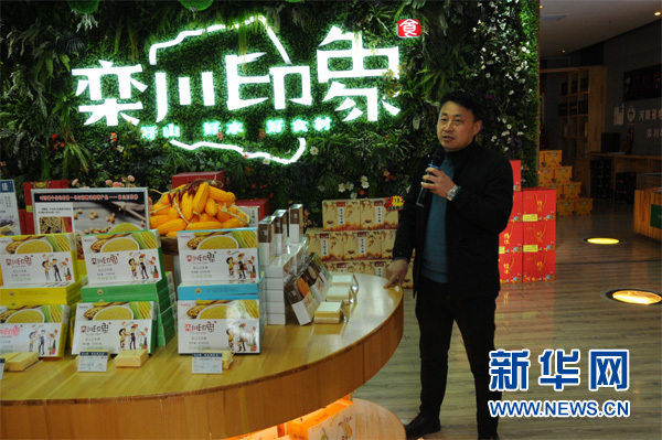 欒川縣農(nóng)業(yè)農(nóng)村局局長(zhǎng)黃正煊為記者介紹“欒川印象”品牌發(fā)展及助農(nóng)情況。新華網(wǎng) 張朝華攝