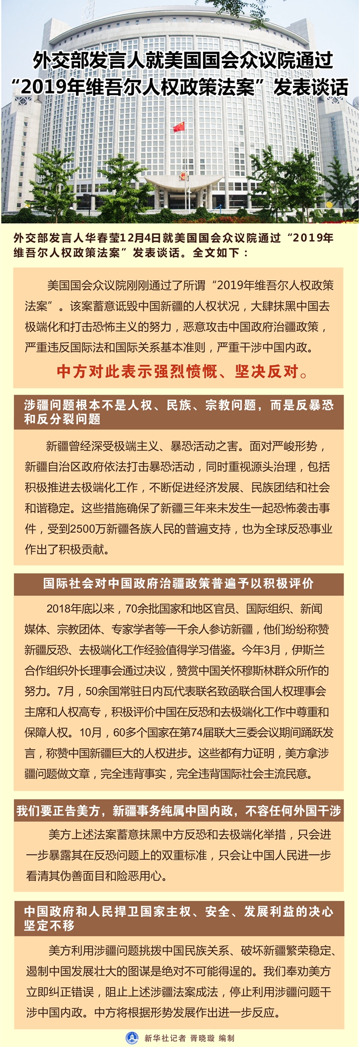 新華社北京12月4日電 外交部發(fā)言人華春瑩4日就美國國會眾議院通過“2019年維吾爾人權政策法案”發(fā)表談話。全文如下: