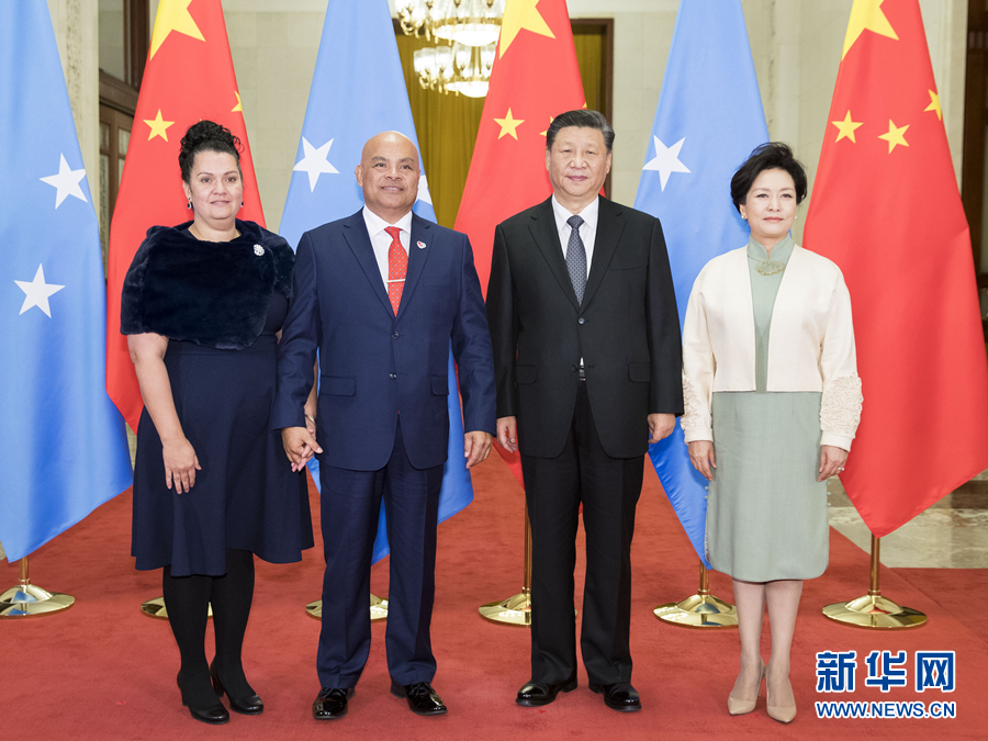 12月13日,國家主席習(xí)近平在北京人民大會堂同密克羅尼西亞聯(lián)邦總統(tǒng)帕努埃洛會談。這是會談前,習(xí)近平和夫人彭麗媛同帕努埃洛總統(tǒng)和埃德溫女士合影。 新華社記者 黃敬文 攝