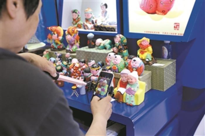 第十四屆中國北京國際文化創(chuàng)意產(chǎn)業(yè)博覽會(huì)現(xiàn)場,觀眾拿起手機(jī)拍攝“中國夢(mèng)”泥塑創(chuàng)作者天津泥人張彩塑作品。本報(bào)記者 劉金夢(mèng) 攝