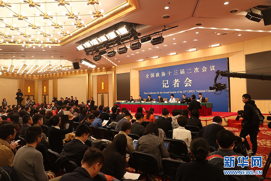 全國政協(xié)十三屆二次會議3月5日15:00在梅地亞中心多功能廳舉行記者會,邀請5位全國政協(xié)委員就“打贏防范化解重大風(fēng)險、精準(zhǔn)脫貧、污染防治三大攻堅戰(zhàn)”回答記者提問。圖為記者會現(xiàn)場。新華網(wǎng)/中國政府網(wǎng) 劉廈 攝