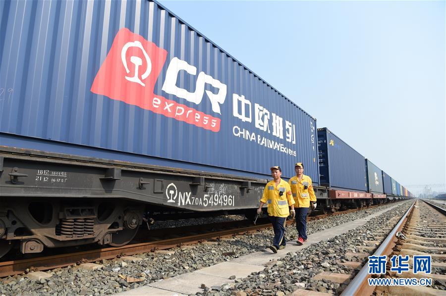 在位于重慶沙坪壩區(qū)的興隆場(chǎng)上行出發(fā)作業(yè)場(chǎng),進(jìn)行列檢作業(yè)的兩名貨車(chē)檢車(chē)員從中歐班列旁走過(guò)(2018年8月29日攝)。新華社記者 唐奕 攝