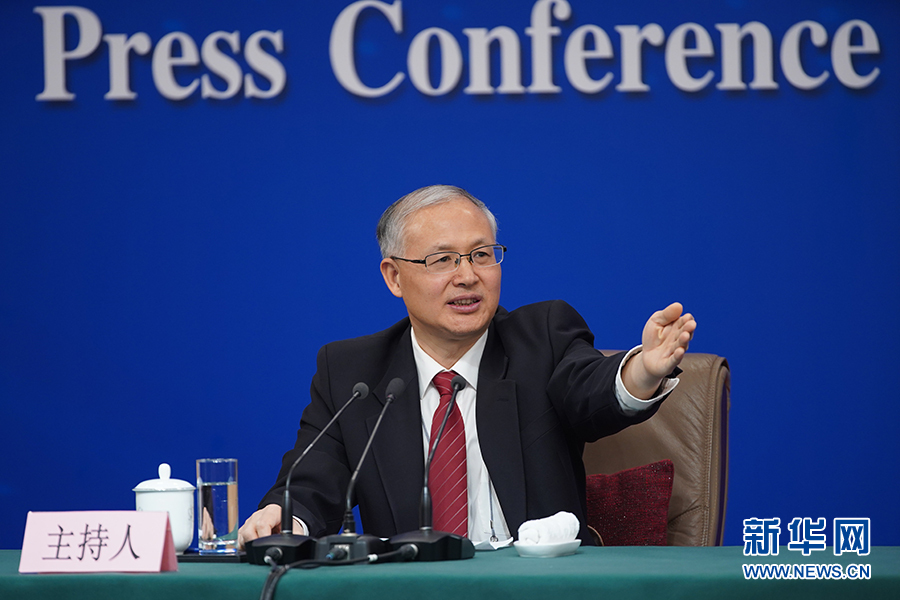 十三屆全國人大二次會議新聞中心于3月11日(星期一)15時在梅地亞中心新聞發(fā)布廳舉行記者會,邀請生態(tài)環(huán)境部部長李干杰就“打好污染防治攻堅戰(zhàn)”相關(guān)問題回答中外記者提問。圖為記者會主持人。新華網(wǎng)/中國政府網(wǎng) 劉廈 攝