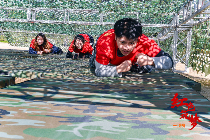 上午九時,一支隊伍正合力將長繩和70面國旗串聯懸掛至旗海中,讓人聯想起第一面五星紅旗在開國大典廣場上飄揚的場景;另一支隊伍的幾位隊員正用PVC管作為連接,合力吹氣將5個氫氣球吹爆,這是在通過游戲的形式致敬1967年的第一顆氫彈爆炸成功;還有一群隊員穿著救生衣、膠鞋扛著自己的隊友穿越洪水區(qū)、獨木橋區(qū)、沼澤地區(qū),還原98 年抗洪搶險、5.12抗震救災的場景……